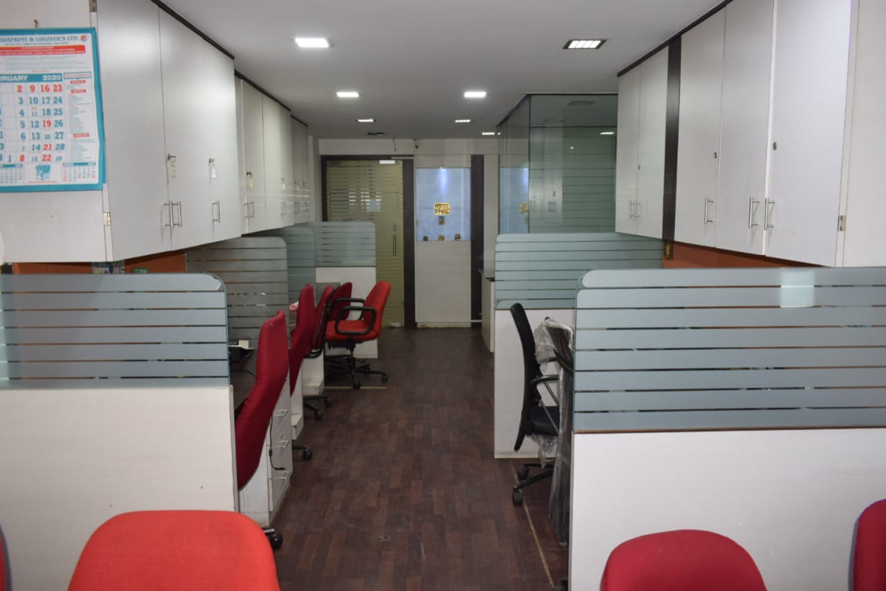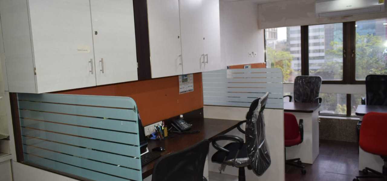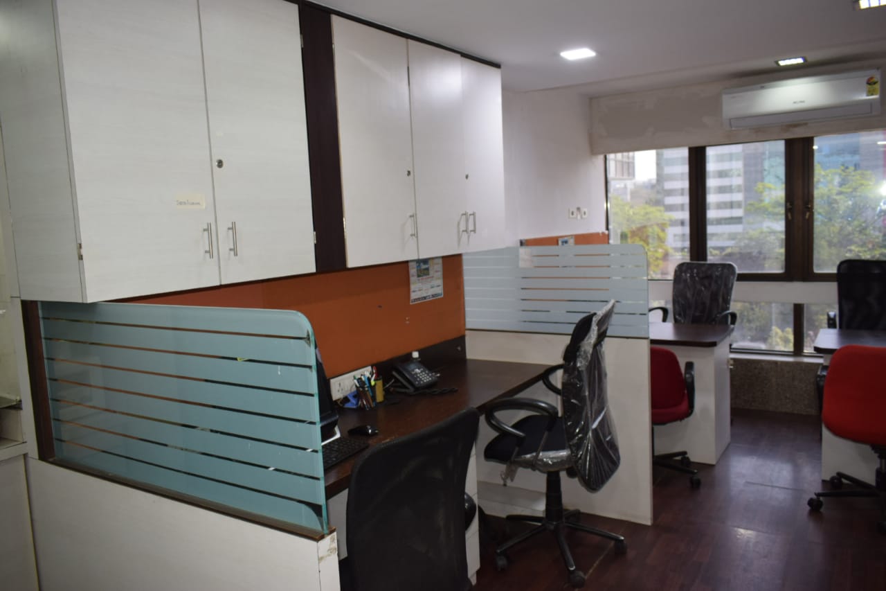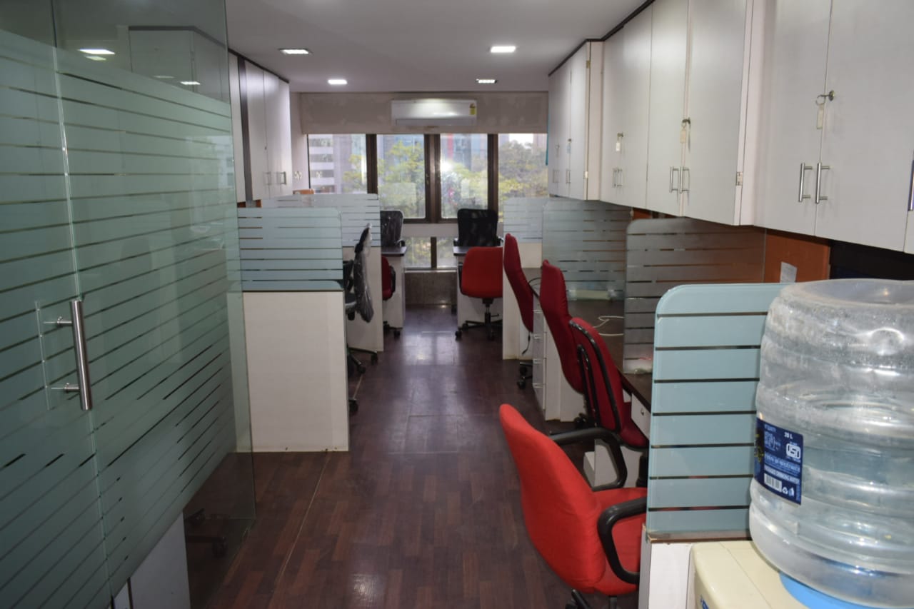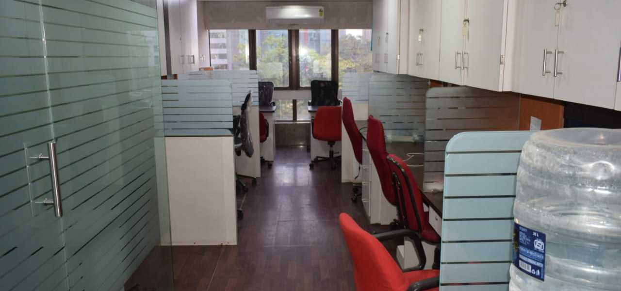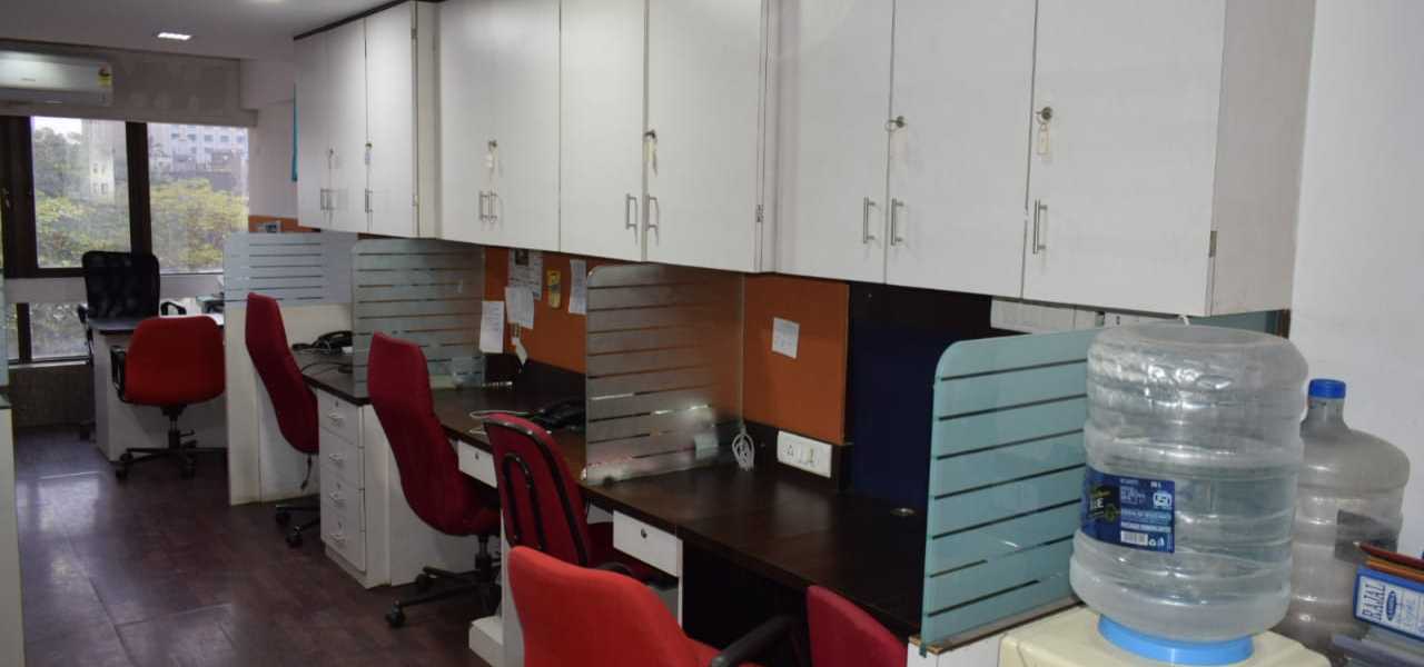Fully furnished office with reception, 10 work station, cabin, washroom, and pantry. A spacious 400 Sq.ft. office for rent at Andheri East. Office include a car parking.